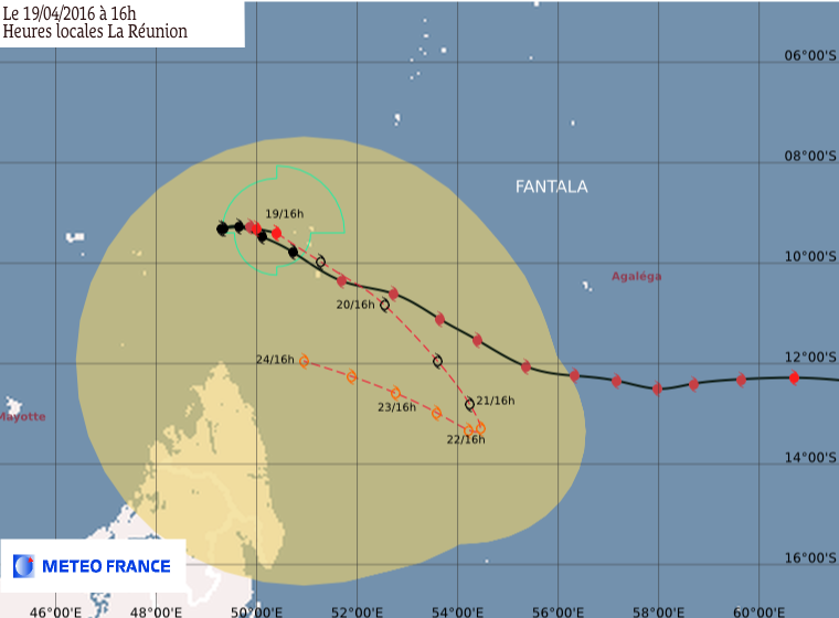 Au niveau de la prévision de trajectoire les modèles numériques, suivis par Météo France et le JTWC, prévoient un recourbement vers le sud-est entre ce soir et demain. Fantala devrait continuer dans cette direction pendant 72h avant de se diriger brutalement vers le nord-ouest. C'est donc désormais potentiellement le nord de Madagascar qui est menacé et non plus Maurice/Rodrigues.